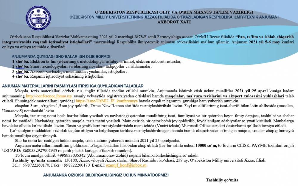 O‘ZBEKISTON RESPUBLIKASI OLIY VA O‘RTA MAXSUS TA’LIM VAZIRLIGI O‘zbekiston Milliy universitetining Jizzax filialida o‘tkaziladigan Respublika ilmiy...