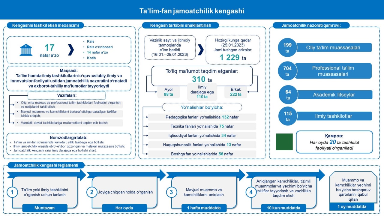 Taʼlim-fan jamoatchilik kengashiga aʼzolar saralanmoqda Oliy, oʻrta maxsus va professional taʼlim hamda ilm-fanga oid islohotlarga befarq boʻlm......